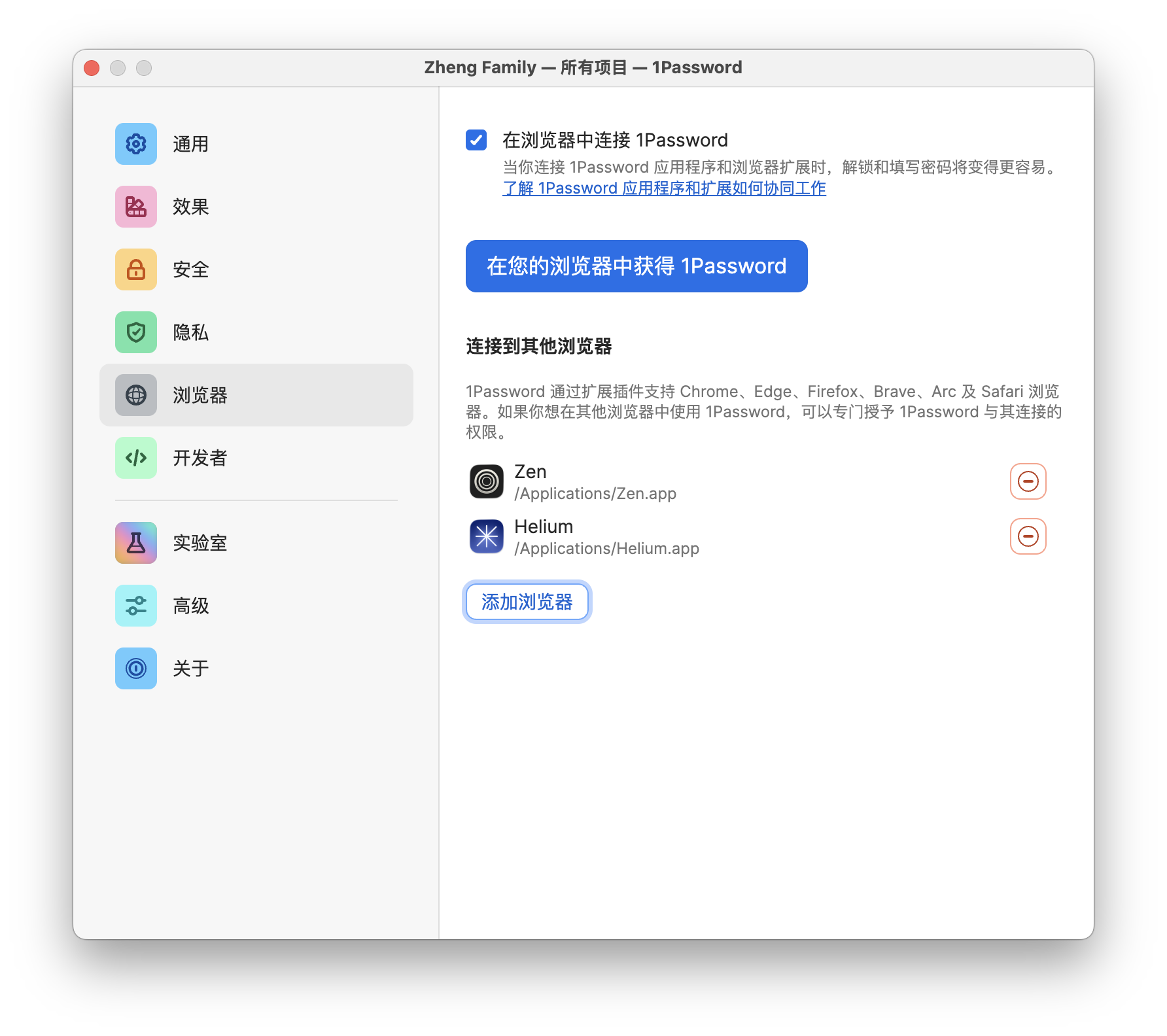 在 1Password 桌面 app 中点击设置,找到「浏览器」选项,在「连接到其他浏览器」部分选择「添加其他浏览器」,然后将其他浏览器添加到列表里就可以了。